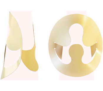 Durch das Überziehen wölbt sich das Objekt um den Arm und erhält so seine eigentliche Schmuckform mit einer nun räumlichen Ausdehnung. Es entsteht eine sichtbare Spannung im Material, die den Schmuck am Körper fixiert. Von der Seite betrachtet schmiegt sich die Form an, von vorne gesehen dehnt sie sich aus, rahmt den Arm ein und überwuchert ihn. Je nach Farbe kontrastiert das Schmuckstück den Körper oder verbindet sich mit ihm.