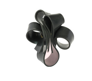 Eine Ringschiene und vier ebenfalls gelochte Streifen aus Gummi (EPDM) lassen sich anhand einer veredelten und so dem Alltag enthobenen Musterbeutelklammer im Handumdrehen zu unterschiedlichen, mehr oder weniger üppigen Ringvarianten zusammenstecken.
