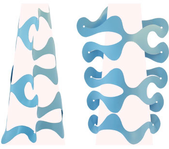 Durch das Überziehen wölbt sich das Objekt um den Arm und erhält so seine eigentliche Schmuckform mit einer nun räumlichen Ausdehnung. Es entsteht eine sichtbare Spannung im Material, die den Schmuck am Körper fixiert. Von der Seite betrachtet schmiegt sich die Form an, von vorne gesehen dehnt sie sich aus, rahmt den Arm ein und überwuchert ihn. Je nach Farbe kontrastiert das Schmuckstück den Körper oder verbindet sich mit ihm.