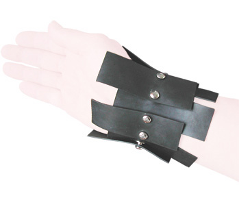 geschnitten, werden in unterschiedlichen Anordnungen spielerisch miteinander verbunden. Sie fügen sich zu martialisch anmutenden Formen zusammen, die das Handgelenk schützend umschließen.